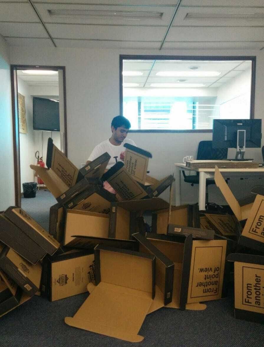 A primeira coisa que o Arturo me colocou pra fazer foi dobrar as caixas de papelão!
