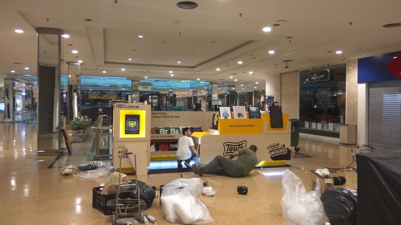 Foi engraçado que o supervisor do shopping não acreditou e ficou tirando fotos nossas carregando as placas de madeira pelos corredores do shopping de madrugada. Ele disse que foi a primeira vez que viu os próprios donos da loja fazendo a montagem.