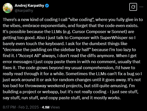 Mês passado Andrej Karpathy cunhou o termo “Vibe coding” e a bolha startupeira adorou.