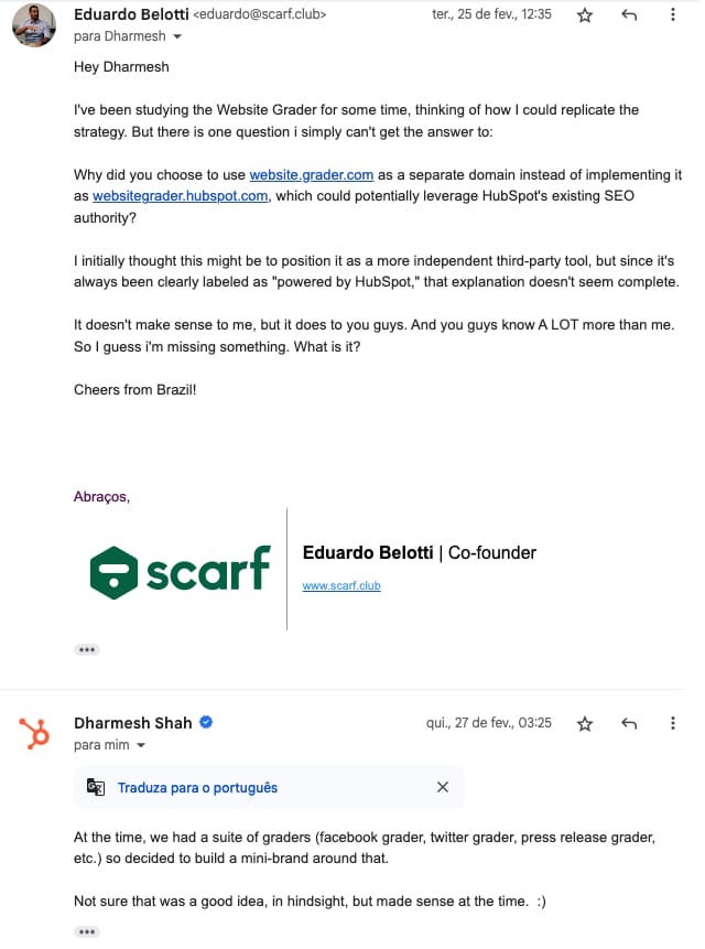 Então achei o email do fundador do Hubspot e mandei um email perguntando.