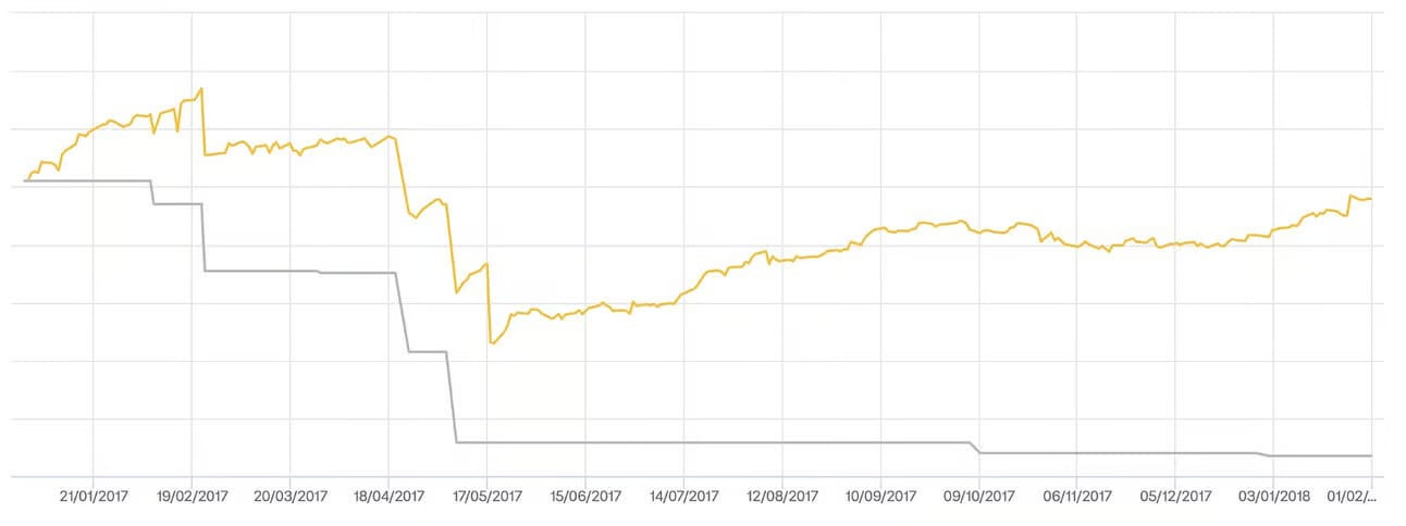 A curva em cinza foi o dinheiro que eu investi. Em amarelo, o patrimônio total (investido + valorização).