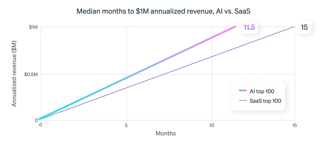 → Mediana de tempo até U$ 1M ARR → AI: 11.5 meses | SaaS: 15 meses