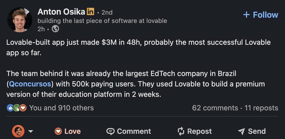 Por falar em produtos de AI crescendo como nunca, Anton Osika, founder do Lovable, compartilhou que o produto de mais sucesso criado na plataforma até hoje (fez 3M USD em 48h) é do Brasil! 🇧🇷