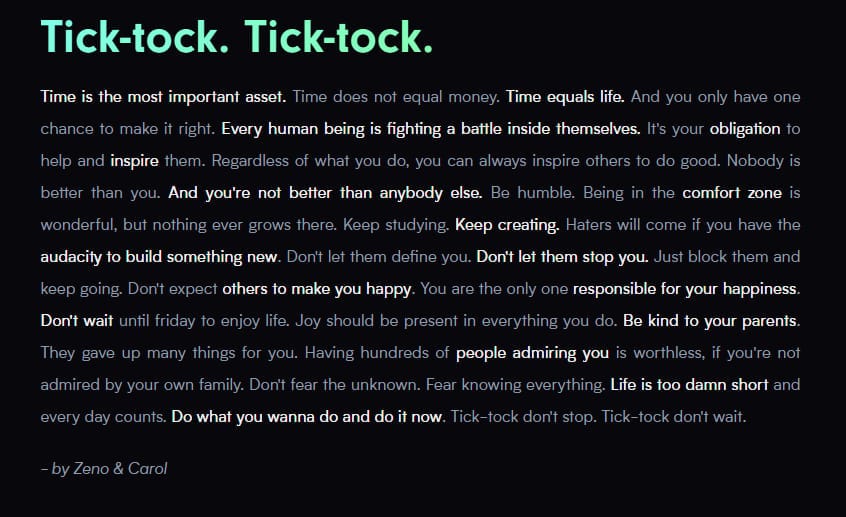 "Tempo é o ativo mais importante. Tempo não é igual a dinheiro. Tempo é igual a vida. E você só tem uma chance de fazer isso certo. Todo ser humano está lutando uma batalha dentro de si mesmo. É sua obrigação ajudar e inspirá-los. Independentemente do que você faz, você sempre pode inspirar outros a fazer o bem. Ninguém é melhor que você. E você não é melhor que ninguém. Seja humilde. Estar na zona de conforto é maravilhoso, mas nada cresce lá. Continue estudando. Continue criando. Haters virão se você tiver a audácia de construir algo novo. Não deixe que eles te definam. Não deixe que eles te parem. Apenas bloqueie-os e siga em frente. Não espere que os outros te façam feliz. Você é o único responsável pela sua felicidade. Não espere até sexta-feira para aproveitar a vida. A alegria deve estar presente em tudo o que você faz. Seja gentil com seus pais. Eles abriram mão de muitas coisas por você. Ter centenas de pessoas te admirando não vale nada, se você não é admirado pela sua própria família. Não tema o desconhecido. Tema saber tudo. A vida é curta demais e cada dia conta. Faça o que você quer fazer e faça agora. O tempo não para. O tempo não espera."