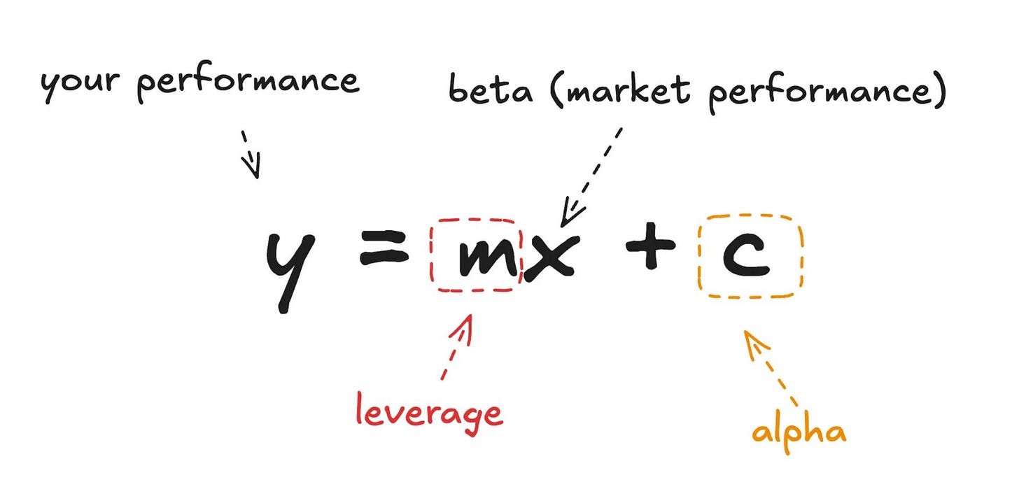 No texto ele fala sobre o conceito de Beta Alavancado. No mercado financeiro, Alpha é sua vantagem em relação ao mercado. É o que te faz ficar a frente dos demais.