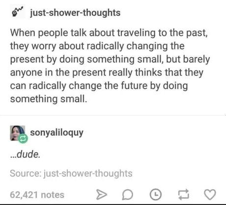“Quando as pessoas falam sobre viajar no tempo para o passado, elas se preocupam em mudar radicalmente o presente ao fazer algo pequeno. Mas ninguém, no presente, realmente acredita que pode mudar radicalmente o futuro ao fazer algo pequeno.”
