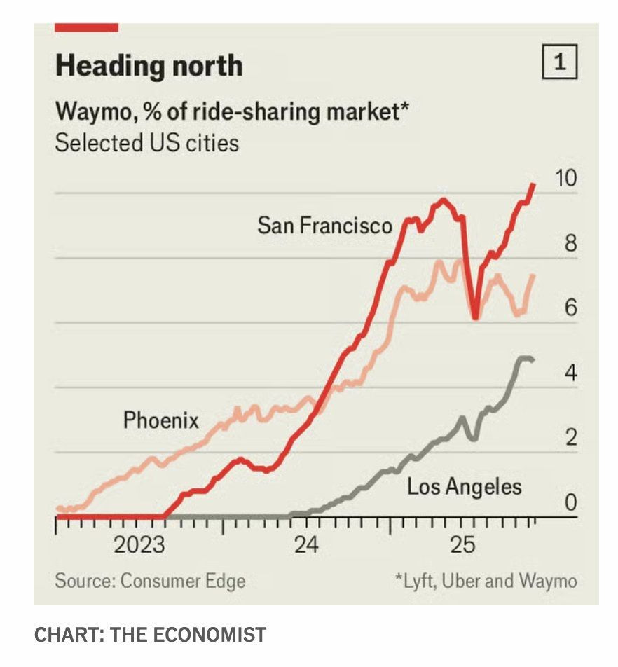 Vi esse gráfico mostrando o crescimento do market share da Waymo (carros autônomos da Alphabet) no mercado de ride-sharing (Uber, Lyft, 99, etc) e fiquei impressionado.