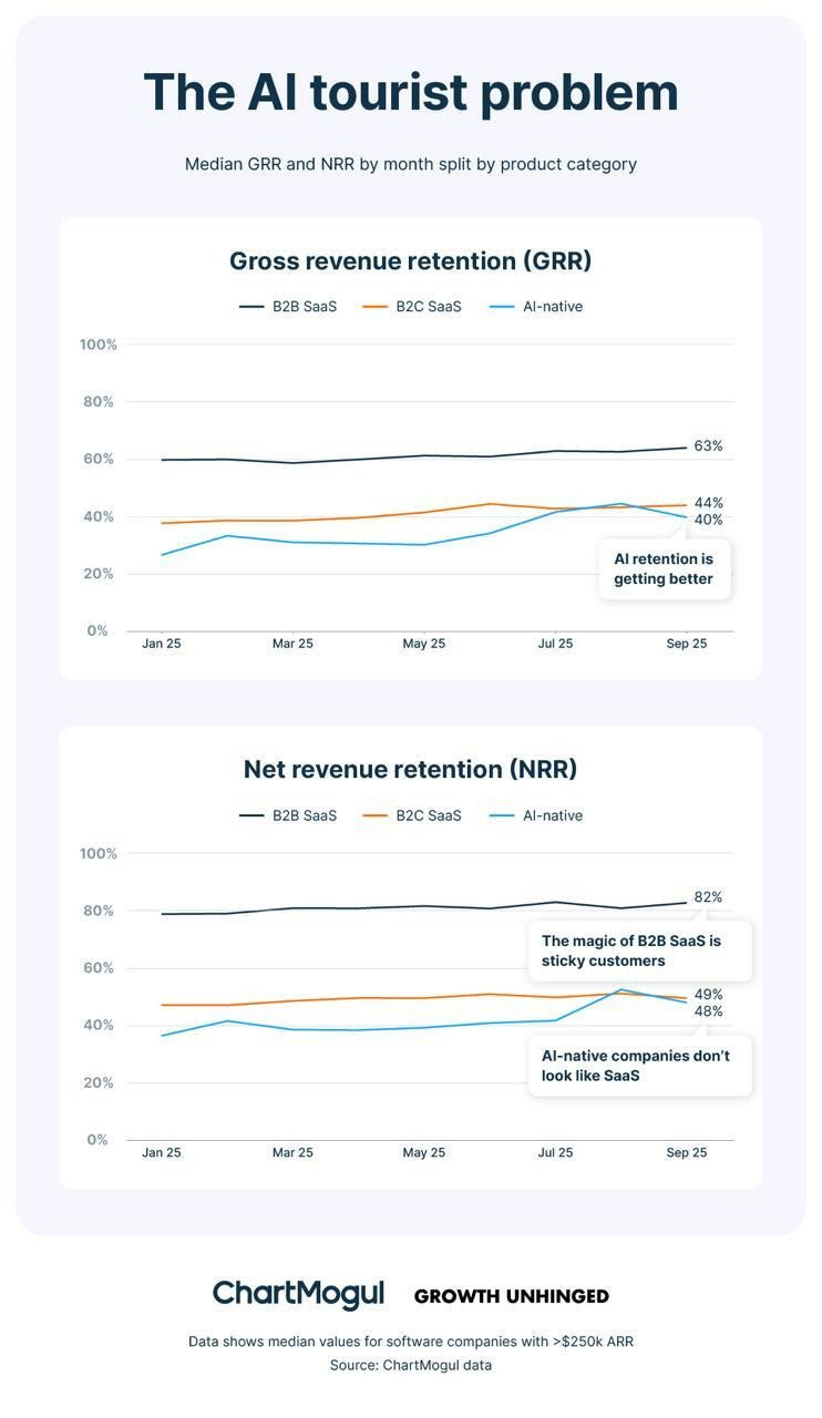 A retenção das empresas de AI se mostrou pior que os SaaS B2B e B2C.