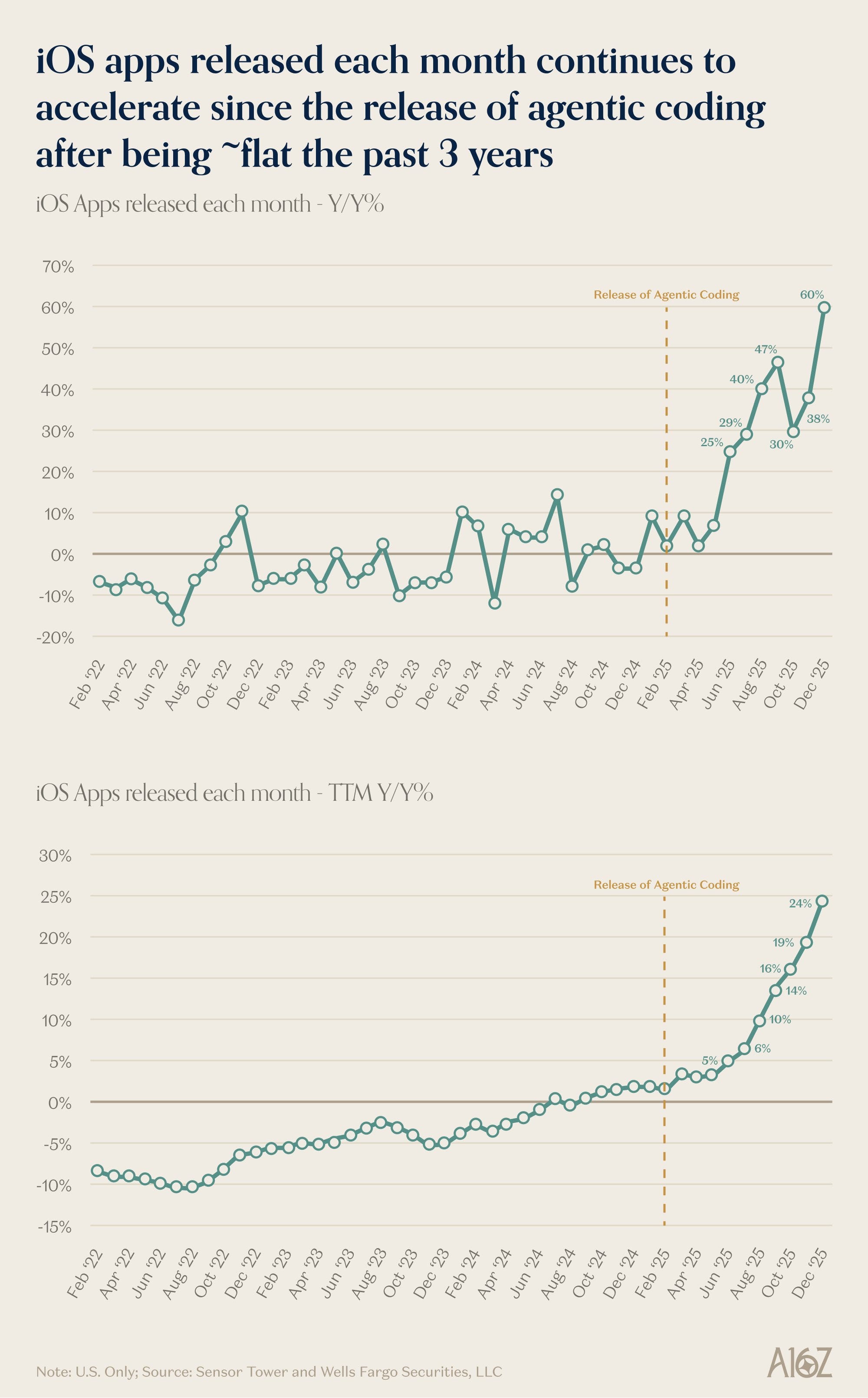Por outro lado, vi esse gráfico da a16z com o lançamento de apps iOS. Depois de 3 anos com praticamente zero crescimento, depois do lançamento das ferramentas de código com AI, esse número disparou.
