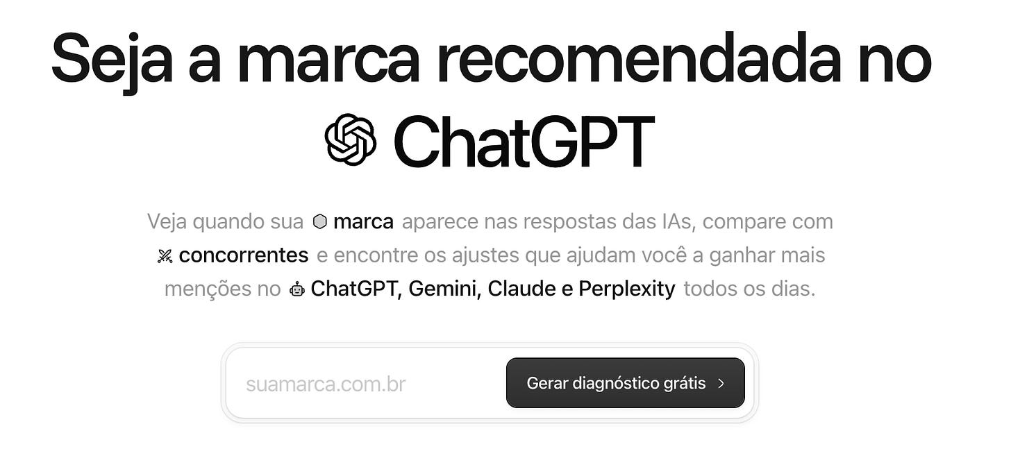 Faz um diagnóstico gratuito pra ver como sua marca aparece hoje nas respostas das IAs.