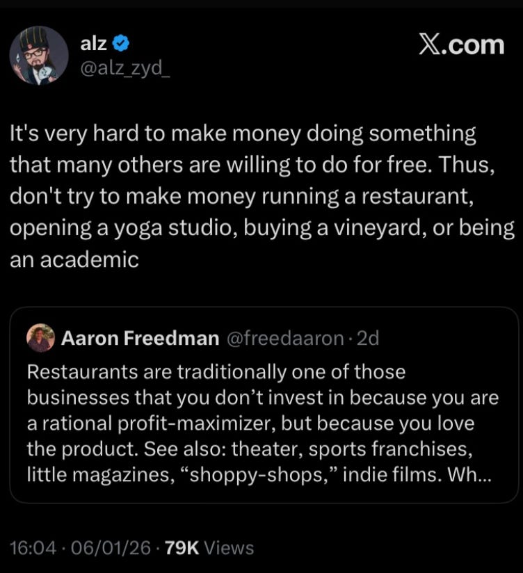 Essas pessoas vão topar ter margens ridículas ou até prejuízo tocando o negócio porque elas não fazem por grana, fazem por paixão. E paixão é irracional.