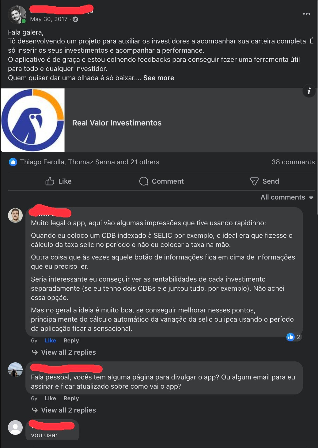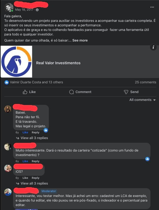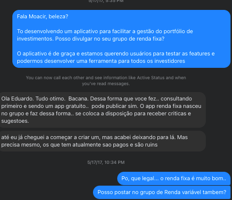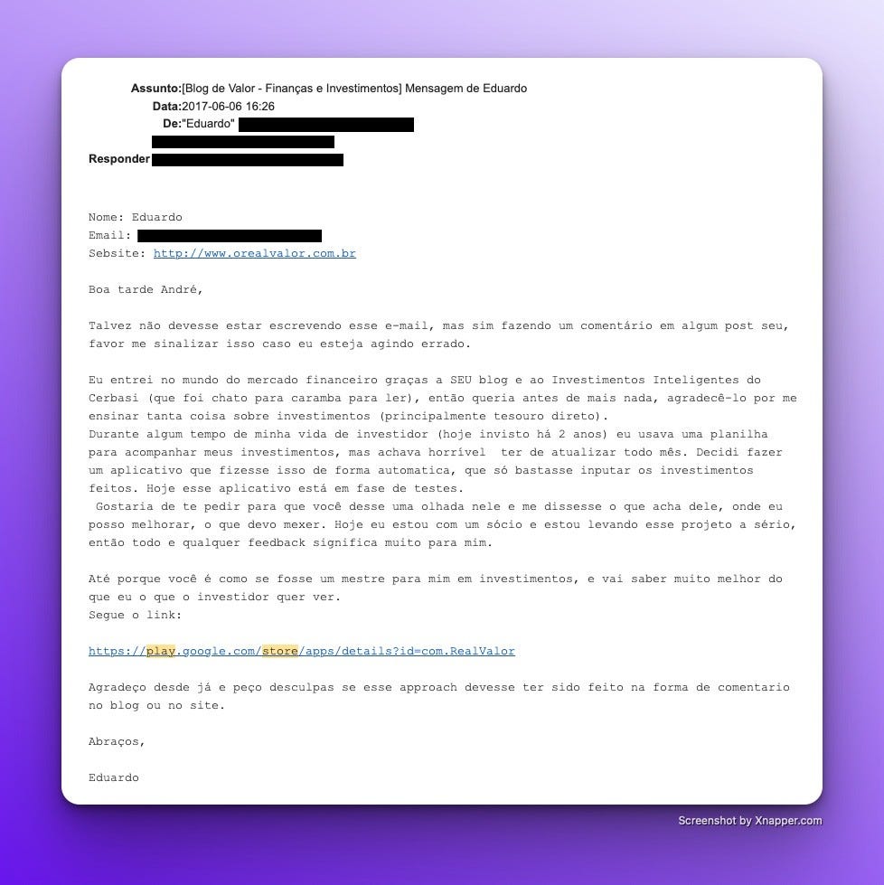 Procurava email de contato e mandava para eles. A mensagem era parecida com a que eu mandava para os donos das comunidades: "Estou fazendo uma ferramenta para ajudar investidores acompanharem o portfolio. Quero feedbacks seus de como melhorar."