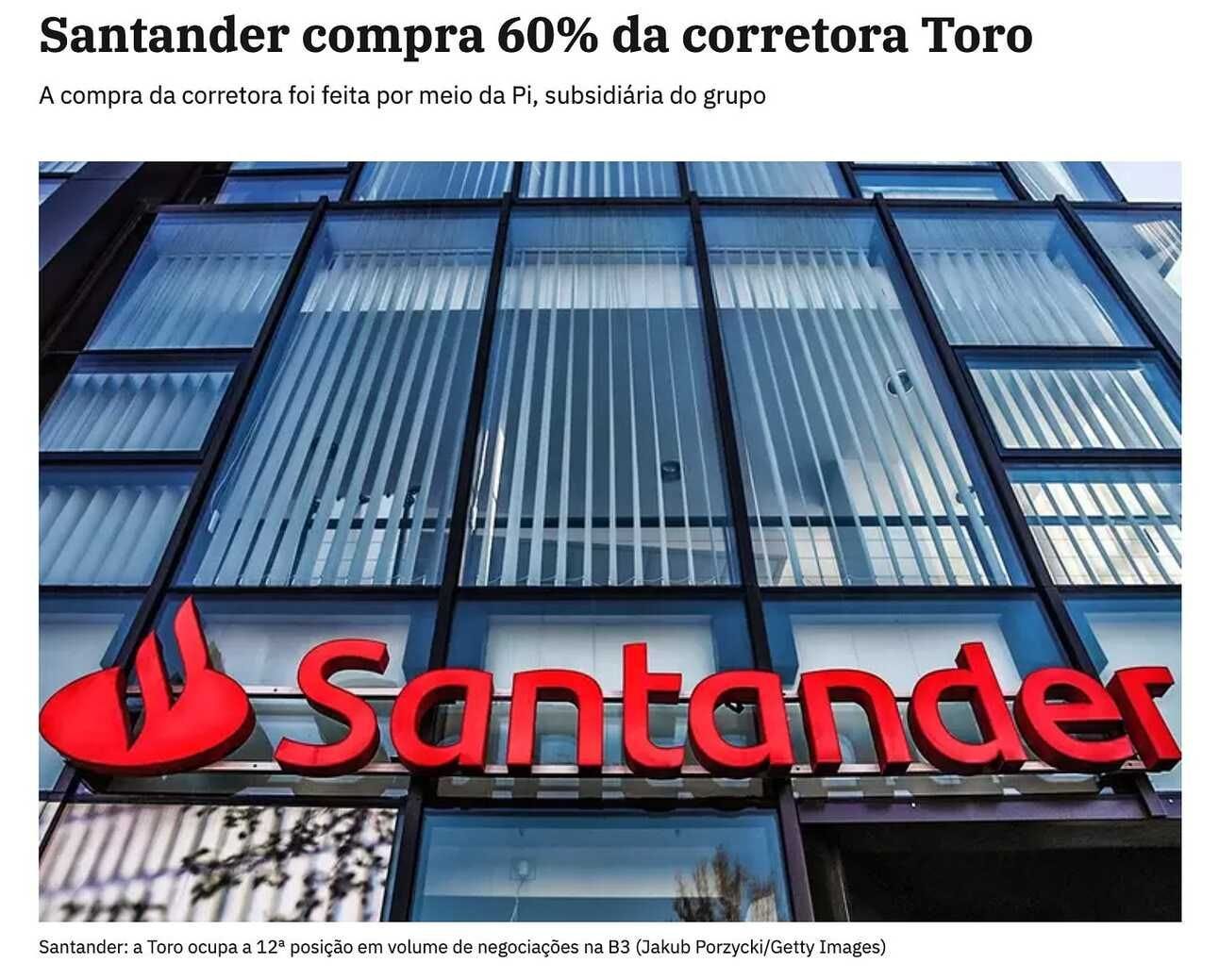 Notícia da compra da Toro pelo Santander