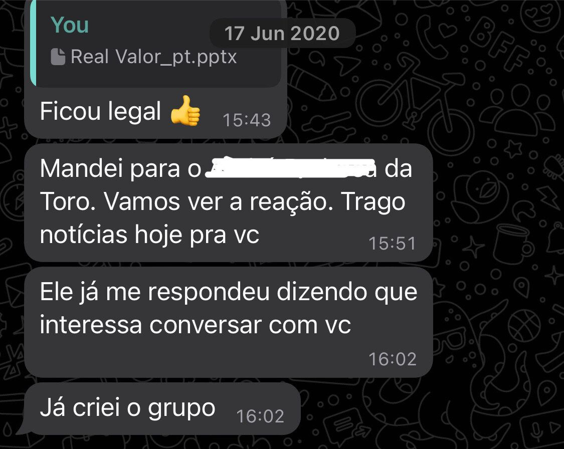 Ao longo da semana, um dos caras da Toro me liga e fala que não ia conseguir ter a reunião na sexta porque eles estavam fechando um deal de investimento na Toro e seria importante levar os detalhes do Real Valor para eles antes de fazer a proposta. Ele pediu para remarcar para a próxima sexta.