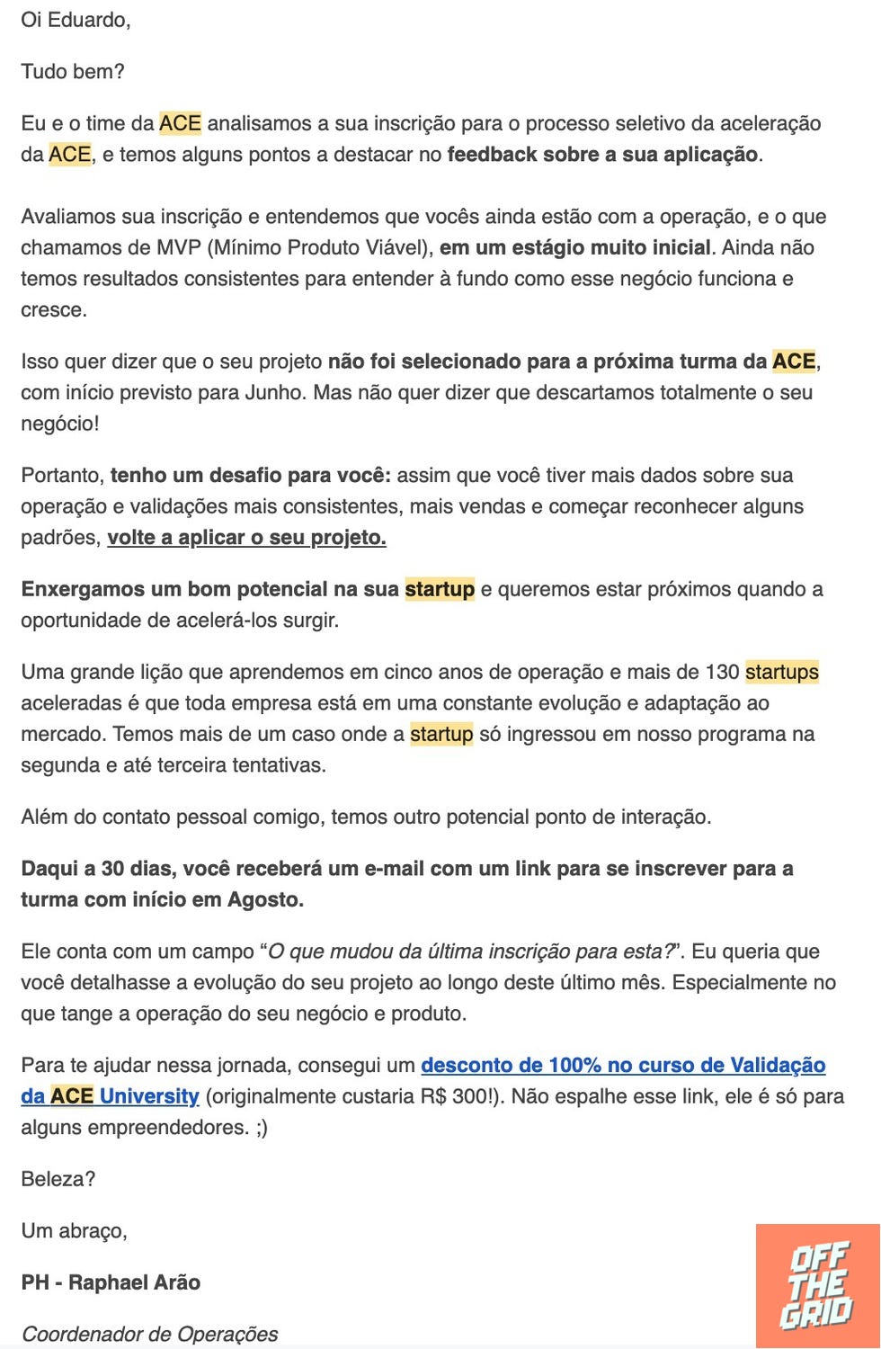 Eis que recebo um email da ACE com o assunto “Feedback ACE: resultado e comentários sobre a sua startup”.