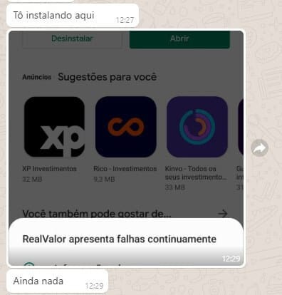 Um cliente mandando msg no whatsapp falando do bug
