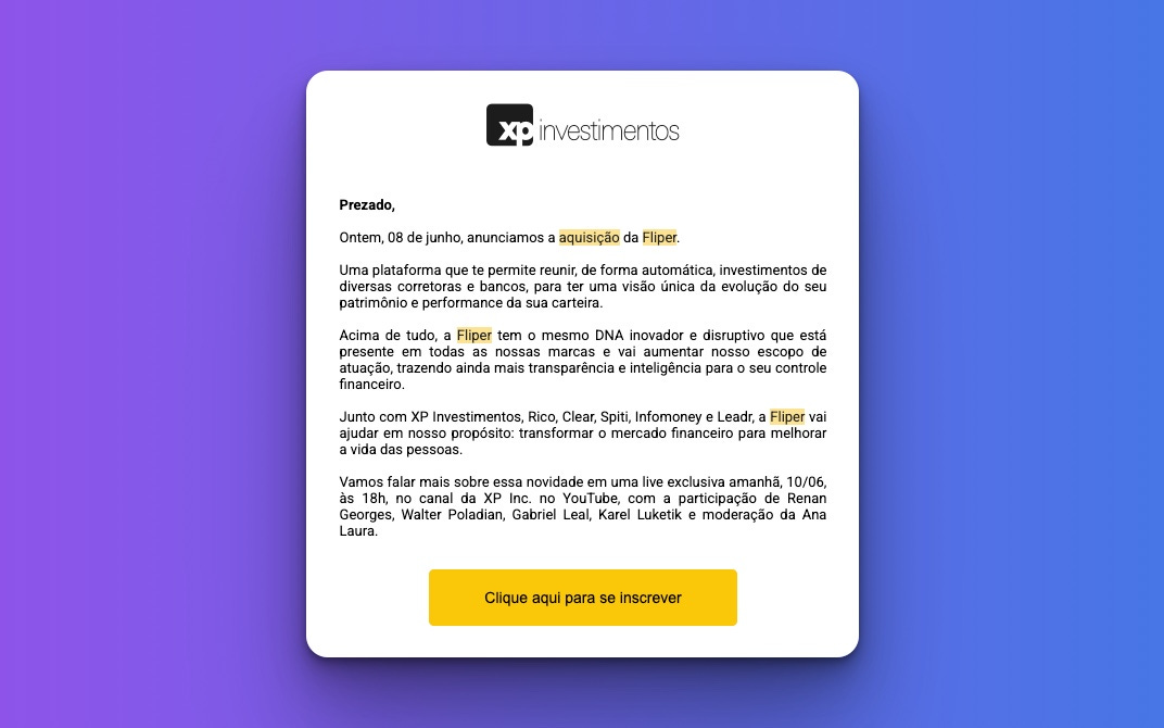 "Eu tenho um escritório afiliado à XP. Eu abro contas para a XP. Com a aquisição da Fliper, eles provavelmente vão empurrar essa plataforma para todos os clientes."