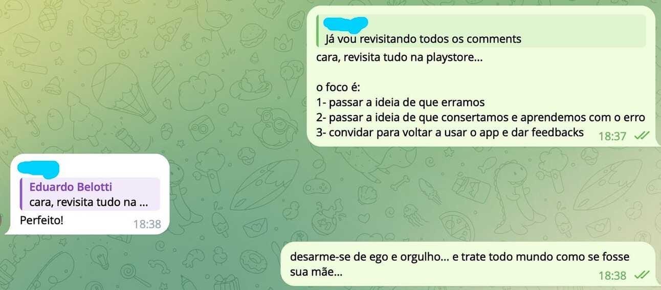 Depois do app ir ao ar, a gente teve que contactar cada usuário que teve problema para explicar o acontecimento e convidar a voltar a usar.
