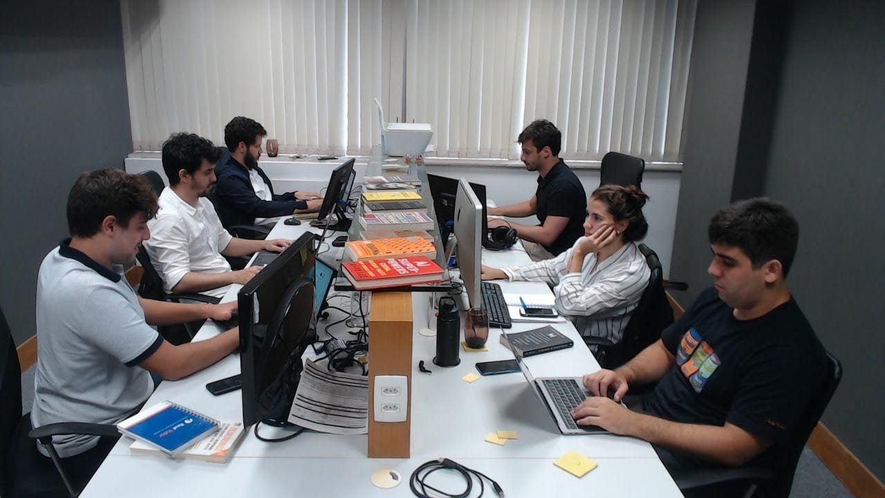 Agora já éramos uma equipe de 7: Além de mim e do Gabriel, o Real Valor contava com 2 desenvolvedores, uma responsável pelo marketing, um responsável por customer success um responsável pelo design.