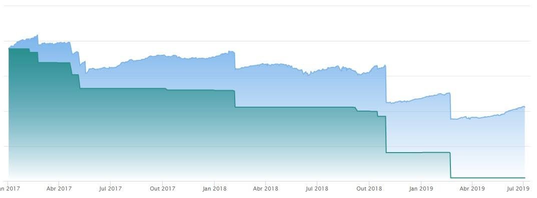 Em verde, o valor investido. Em azul, o patrimônio. Perceba que apesar de fazer saques de tempos em tempos, o patrimônio descia, mas tendia a subir por causa dos investimentos. Caso eu não investisse, meu patrimônio seria a linha cinza.