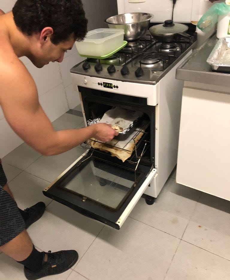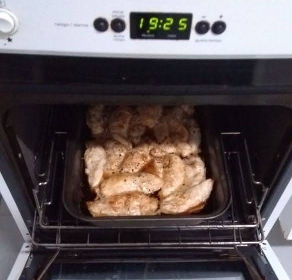 O frango era um problema maior. Era comum a gente chegar em casa lá pelas 23h, botar 2kg de file de frango numa assadeira (com tempero) e colocar no forno para dar menos trabalho do que grelhar.