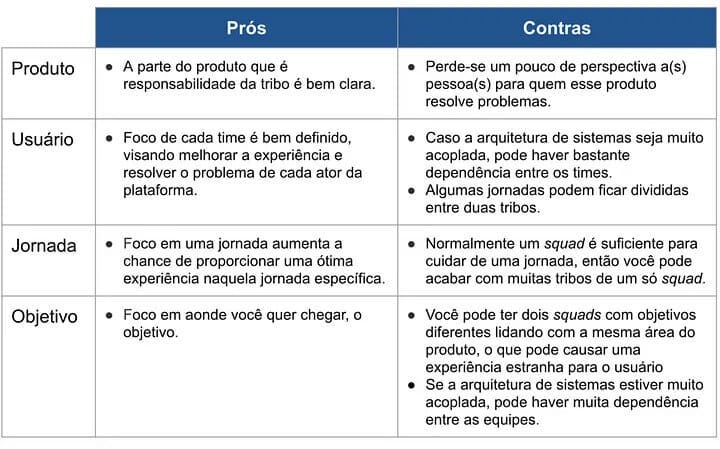 Aqui cabe a você entender o momento da sua empresa e qual dessas divisões vai satisfazer melhor suas necessidades para que seu time realize seu melhor trabalho. O próprio Joca Torres elaborou essa tabela com os prós e contras de cada uma dessas divisões: